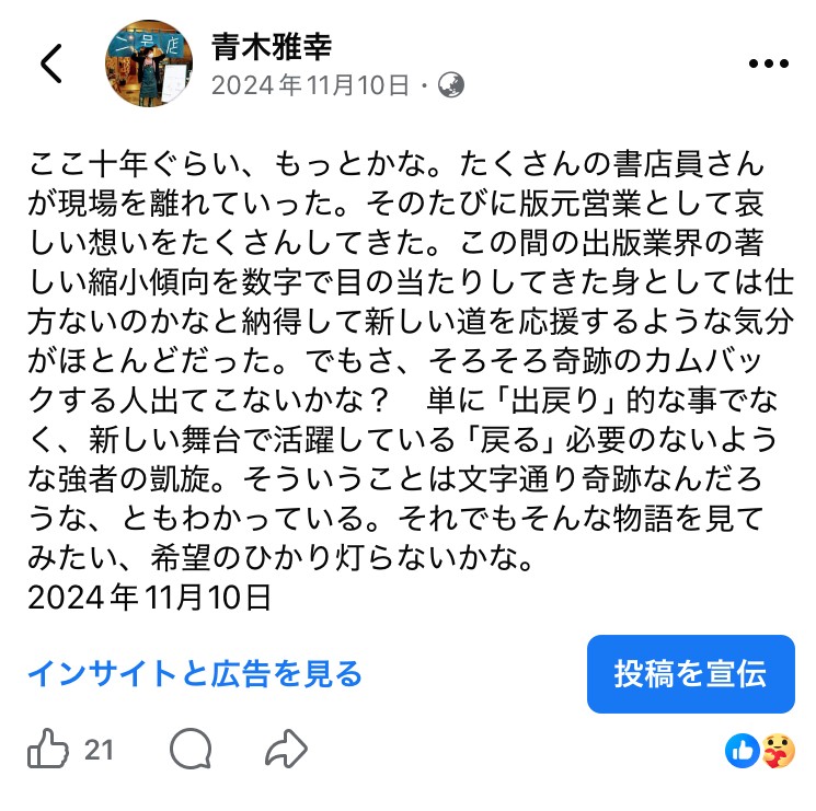 これは私が2024年11月10日にFacebookに書き込んだ投稿のスクリーンショットだ、もちろんこの段階で中村優子さんが本屋開業に思い馳せていることを知ってのポストであったし、「中村優子」というバイネームが想定できていなかったら書いてないし、そんな希望は持てなかったと思う。それほど「中村優子」という人には期待できる何かがあったと思う。