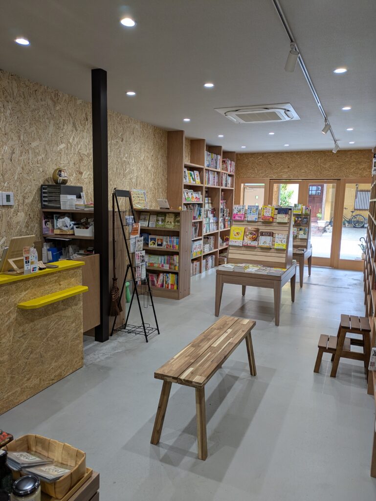 ただ、ノスタルジーやひとりよがりのお店ではない、流行の独立系書店を選ばなかった以上は、地域の本屋として存在意義のある空間になろうという気概が感じられる。店内の照明は明るいし、児童書コーナには小さな子たちが座り読み出来るような椅子もある。全体が長方形で死角が少ないレイアウトは防犯上も優れている。さらにレジ前には長いベンチがあり、お会計だけじゃなく「ついでに、おしゃべりもしていって」といわんばかりだ。お店のオリジナルグッズや中村優子さんの出身の兵庫県豊岡市の野菜や加工食品も販売されているなどお店の気配りが感じられる。